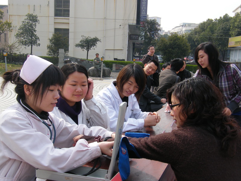 图为博爱医院医护义工为市民测血压。