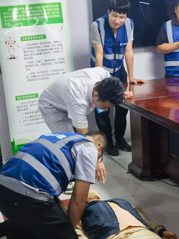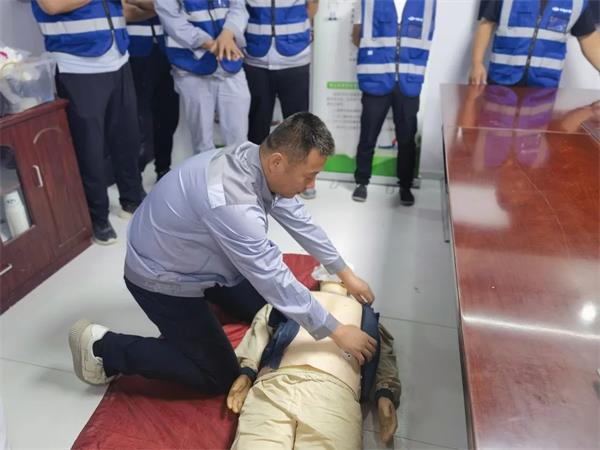 专业培训结束后,职工们积极地上台进行实操演练,并向刘青雨医师询问还未理解的问题,得到悉心指导后再一次巩固了相关急救知识。通过练习,职工们慢慢掌握了心肺复苏的操作方法。