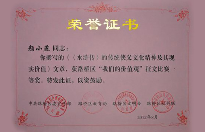 本站讯(记者陈梦)近日,我院办公室两篇征文在区级比赛中获奖。其中颜小燕同志撰写的《水浒传的传统侠义文化精神及其现实价值》获路桥区“我的价值观”征文比赛一等奖;蔡伟标同志撰写的《爱党爱国忠诚敬业——我...2012-09-01310 -