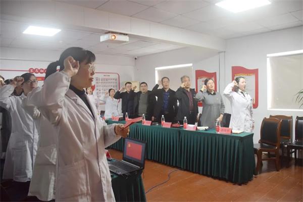 支部书记郑红领读入党誓词,全体党员同志起立,握拳跟读。