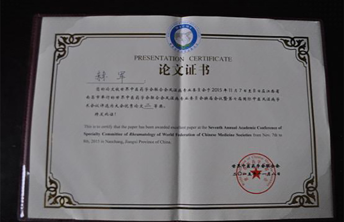 赫军喜获国际中医风湿病学术优秀论文二等奖