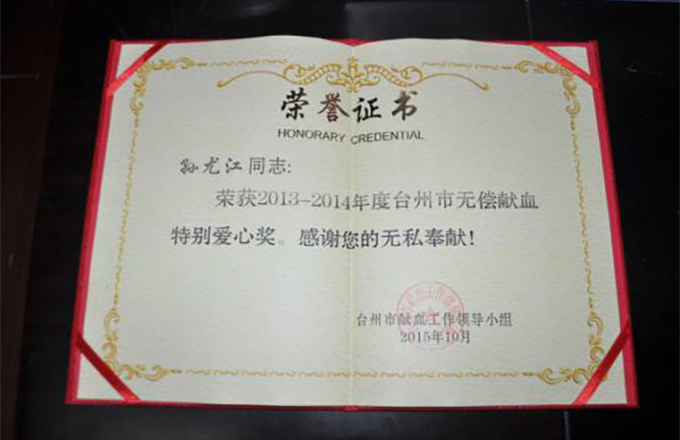 本站讯(记者王艳阳)日前,台州市献血工作领导小组为表彰孙尤江的无私奉献精神,授予他2013——2014年度台州市无偿献血特别爱心奖。 今年46岁的孙尤江是台州市博爱医院120救护车司机,虽然个头不高,却有着“路桥献血大王”、“台州无偿献血宣传员”的称号。孙尤江16年来义务献血累计7.6万毫升,车子开到哪里,无偿献血就宣传到哪里,以此让人们更加关爱生命和关注无偿献血。 &e...2015-11-12223 -
