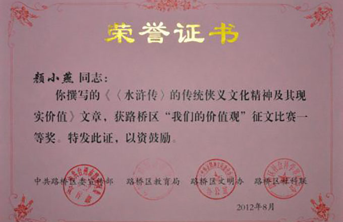 本站讯(记者陈梦)近日,我院办公室两篇征文在区级比赛中获奖。其中颜小燕同志撰写的《水浒传的传统侠义文化精神及其现实价值》获路桥区“我的价值观”征文比赛一等奖;蔡伟标同志撰写的《爱党爱国忠诚敬业——我的人生价值观》文章获路桥区“我的价值观”征文比赛三等奖。 2012-09-012012-09-01304 -