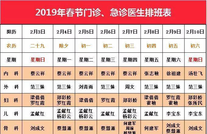 2019春节排班表 阳历2月3日~10日 农历十二月二十九至正月初六2019-01-29814 -