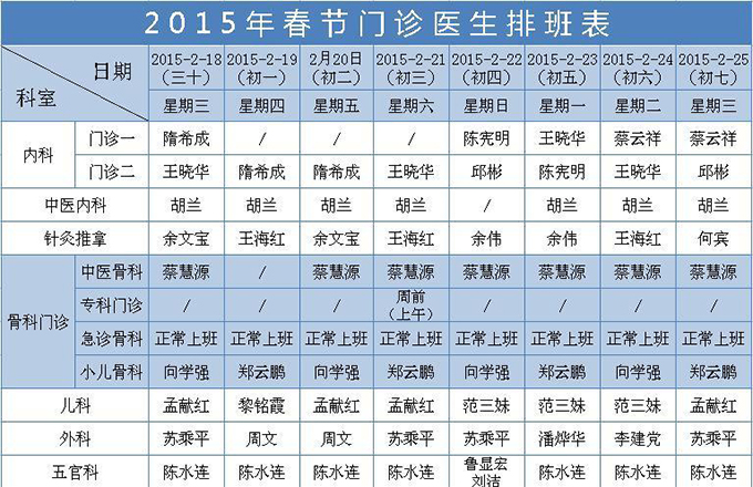 博爱医院春节门诊排班表