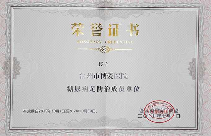近日,台州市博爱医院 被浙江省糖尿病足联盟授予 糖尿病足防治成员单位。 同时, 手足一科主任/副主任医师吴春、 手足二科主治医师吴维国 被聘为浙江糖尿病足联盟委员。 浙江省糖尿病足联盟的设立旨在 聚集浙江省内糖尿病足防治领域的 多学科专业人士, 在中国糖尿病足联盟的框架下, 加强糖尿病足的诊断、治疗、 预防、护理、康复等 一系列的研究和工作, 加强专业间的协作和交流, 推动全省糖尿病足整体...2019-10-31227 -