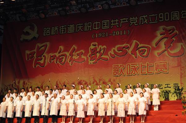 本站讯(记者 蔡伟标)为了隆重庆祝中国共产党成立90周年,发扬党的光荣传统,讴歌党的丰功伟绩,展示商城路桥的时代风采,激发全区人民热爱祖国、热爱中国共产党,建设中国特色社会主义的热情,七一前夕,我院先后参与了由中共路桥区委、区政府主办的路桥区庆祝中国共产党成立90周年“颂歌献给党”大合唱比赛活动及路桥街道党工委组织的“唱响红歌心向党”歌咏比赛。图为我院合唱团全体成员饱含激情的演唱最终获得了街道红歌赛一等奖。