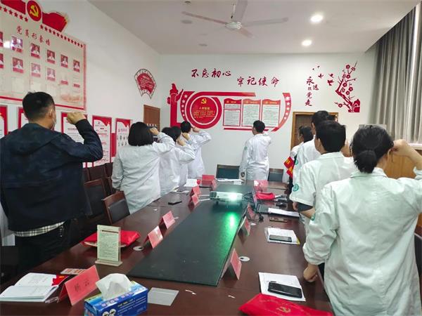 医院专职党委副书记周海平领读入党誓词,分院各支部书记领誓,在座的党员同志起立,面向党旗,握拳跟读。重温入党誓词,进一步增强党组织的凝聚力和战斗力,激励党员坚定爱党、信党、跟党走的理想信念。