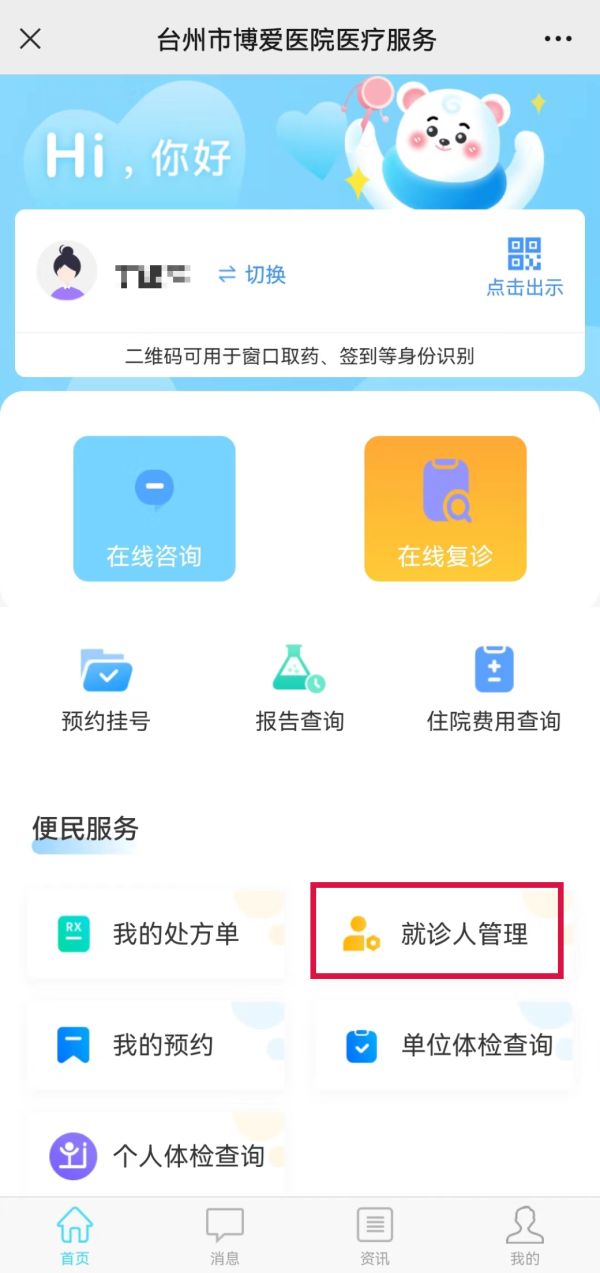 点击“就诊人管理”,绑定“添加就诊人”,如已有账户,直接一键快速关联即可;如首次使用,请先添加就诊人信息,确保信息准确无误,点击确定,选择就诊账户。