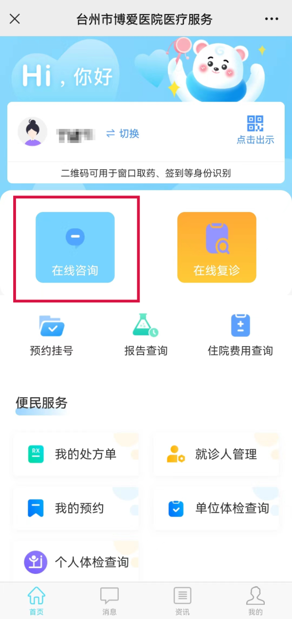 识别下方二维码,关注“台州市博爱医院医疗服务”公众号,点击底部“就医指南”,选择“就医服务”,阅读《服务须知》后,进入台州博爱医院互联网医院。