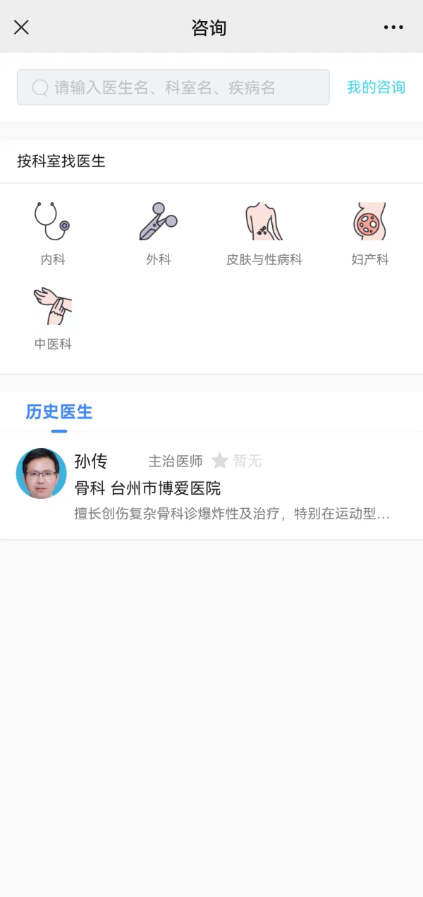 来自内科、普外科、骨科、妇产科、皮肤科、中医科、脑康复科、儿科,五官科、肿瘤科等多个科室的医生线上接诊,支持图片、语音等多种方式,进行病情描述。