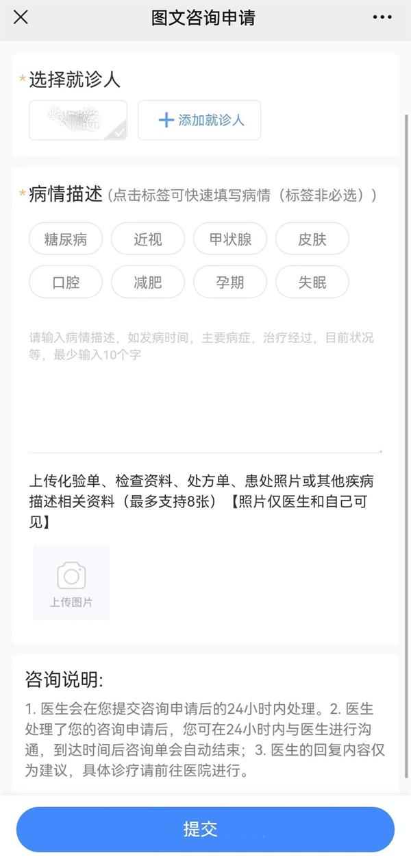 “填写病情信息”进入问诊,与医生进行图文交流。