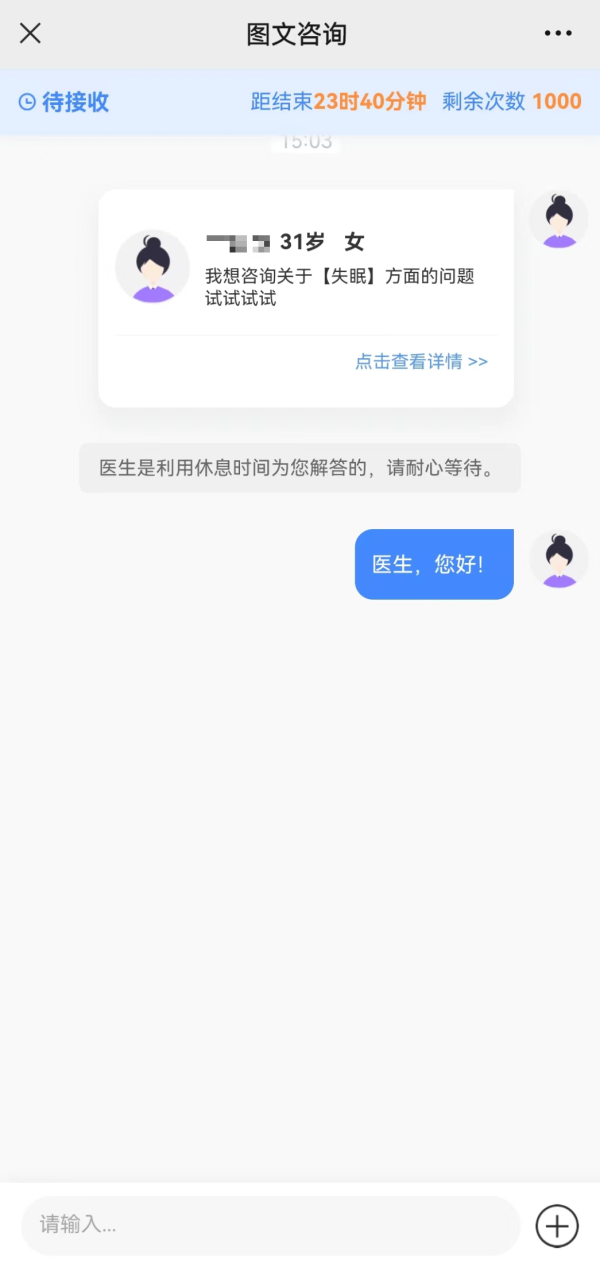 3、您申请问诊后,医生会利用空闲时间接诊,请耐心等待。如问诊申请后24小时内未及时接诊,系统会自动取消,在此之前您也可自行取消。
