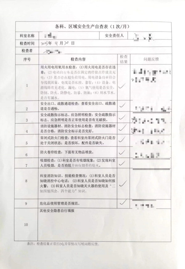 会议给各区域消防安全负责人发放《各科、各区域安全生产自查表》,各科、各区域消防安全管理负责人全面摸清消防安全现状,查清消防安全隐患问题,严肃查处火灾隐患和违法违规行为,并列出问题清单,尽快拿出整改方案,明确整改时限,确保责任到人,不留死角,对发现的火灾隐患将按“从严从快”的方式处理。
