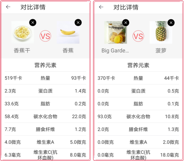 注:左图是香蕉干VS香蕉,右图是菠萝干VS菠萝。