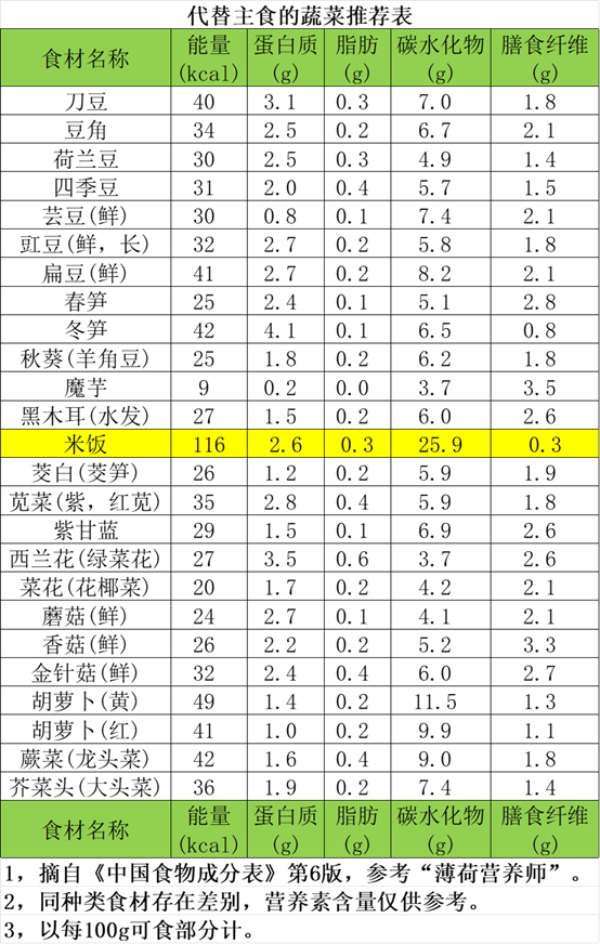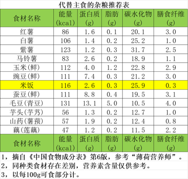 编者特意将米饭放在表格之中,是为方便大家比较。这些薯芋、鲜豆、玉米、莲藕等等杂粮,与米饭比较,营养素的构成,特别是膳食纤维,明显优于米饭。而且,我们可能轻易吃下一碗米饭,但是难以咽下一碗杂粮,不知不觉,摄入能量明显减少。