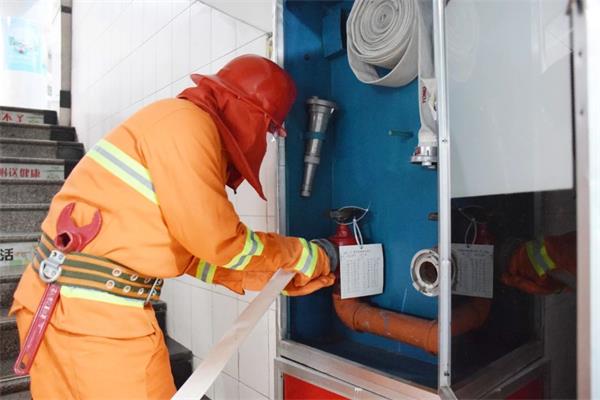 巡逻保安提着灭火器闻声赶来,对着火焰灭火。消控中心值班人员接到报火警并确认火情后,立即对讲机通知微型消防站人员穿防火服赶到着火现场,消防站人员打开消火栓、甩水带、接卡扣水枪、开阀门、喷水灭火。