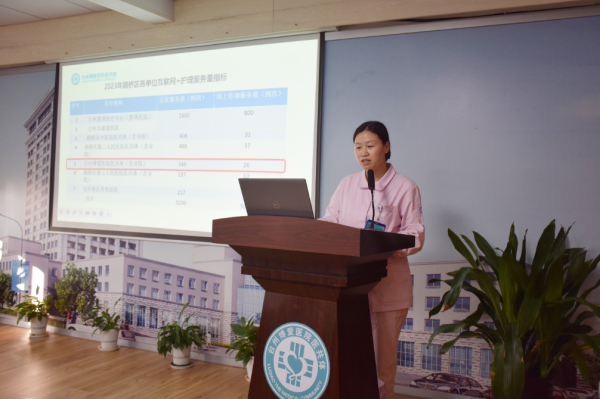 总院护士王妮娜汇报医共体互联网+护理服务任务指标及开展情况。