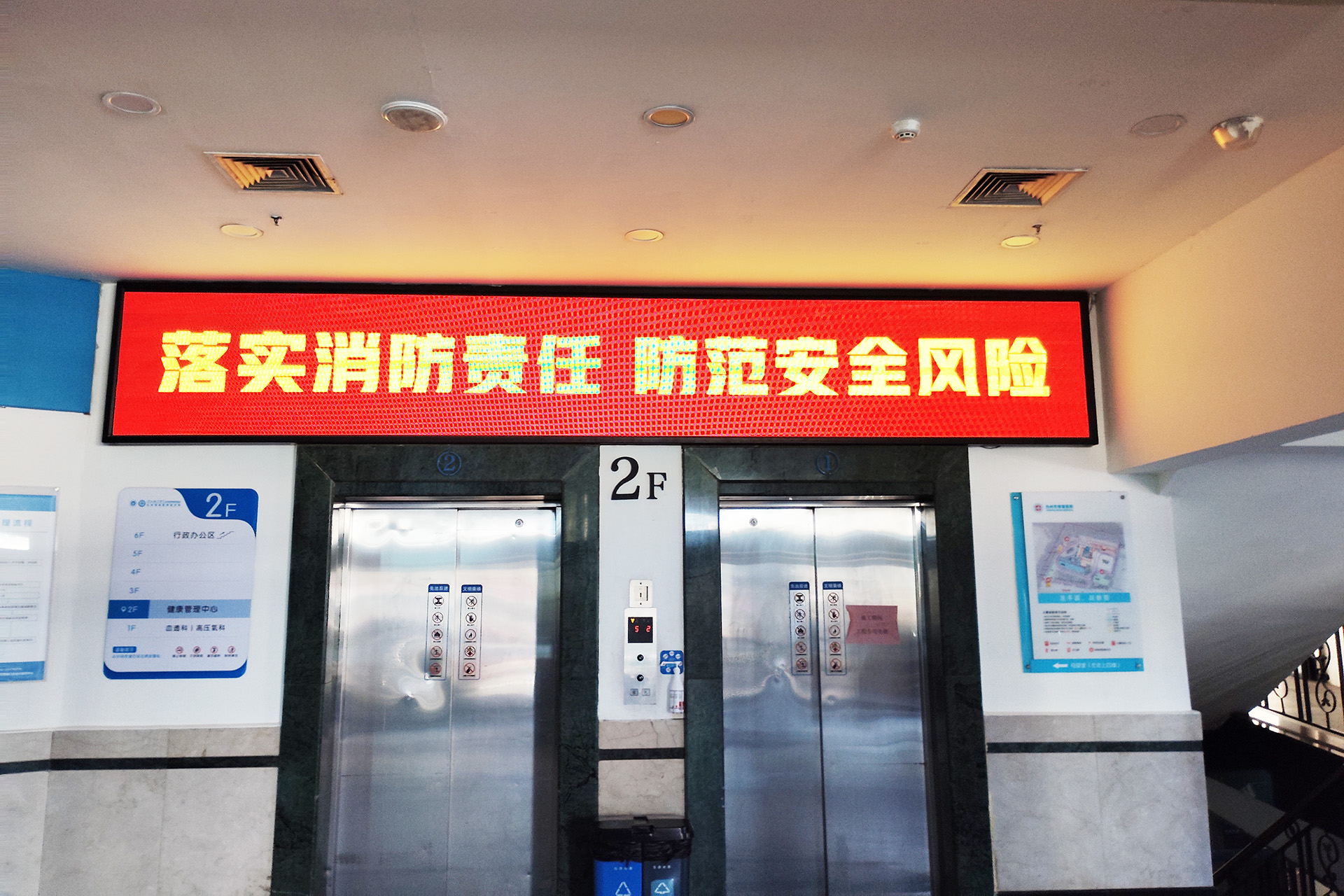 在院内各显眼处张贴消防安全宣传资料,并利用公共视频、LED电子屏滚动播放消防安全标语和消防安全知识。这些宣传以鲜明的色彩,吸引了全体职工及病人的目光,营造了浓厚的消防安全氛围。