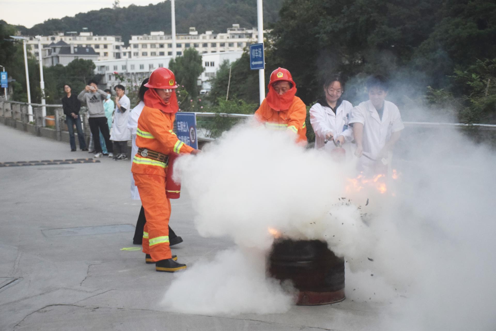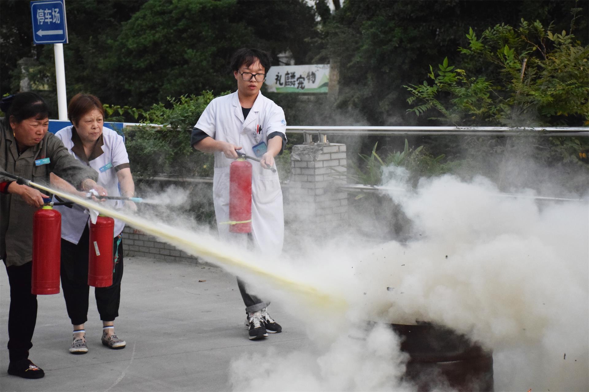 灭火技能演练活动现场,周军辉详细讲解和认真示范了灭火器的使用方法,并让一些重点岗位的人员进行模拟火情实际操作。医护人员们纷纷上阵,将理论与实践相结合,开展火情扑救。
