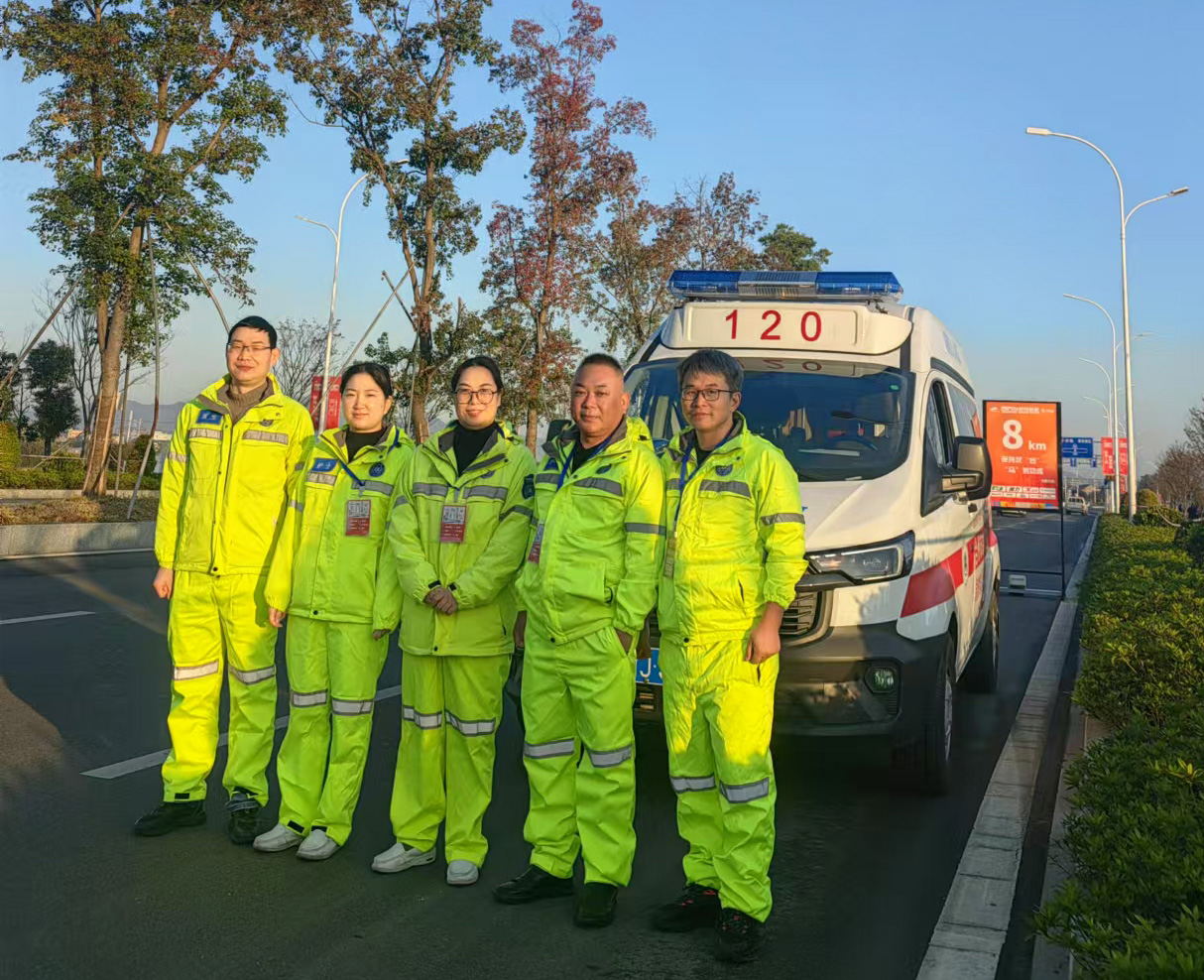 赛事当天早上6:10,医疗保障团队所有人员早早在医院集合,统一出发前往赛道开展驻点医疗保障工作。