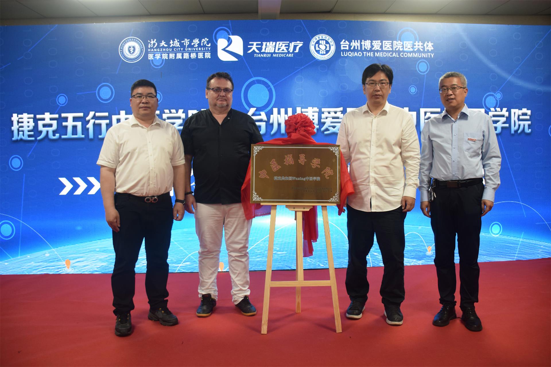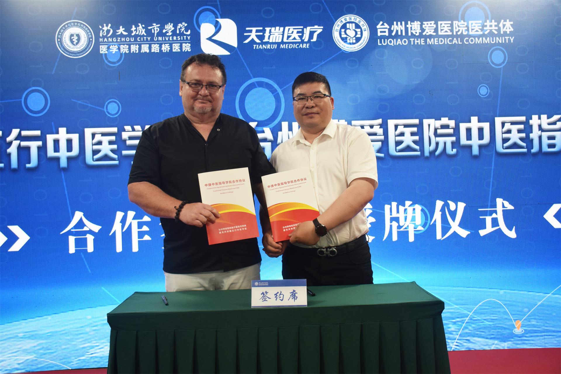 致辞结束后,活动迎来核心环节之——签约揭牌仪式。在与会嘉宾的共同见证下, 台州博爱医院医共体党委副书记、总院院长干军辉与捷克Wuxing中医学院创始人、院长Petr为中捷中医指导学院进行签约。