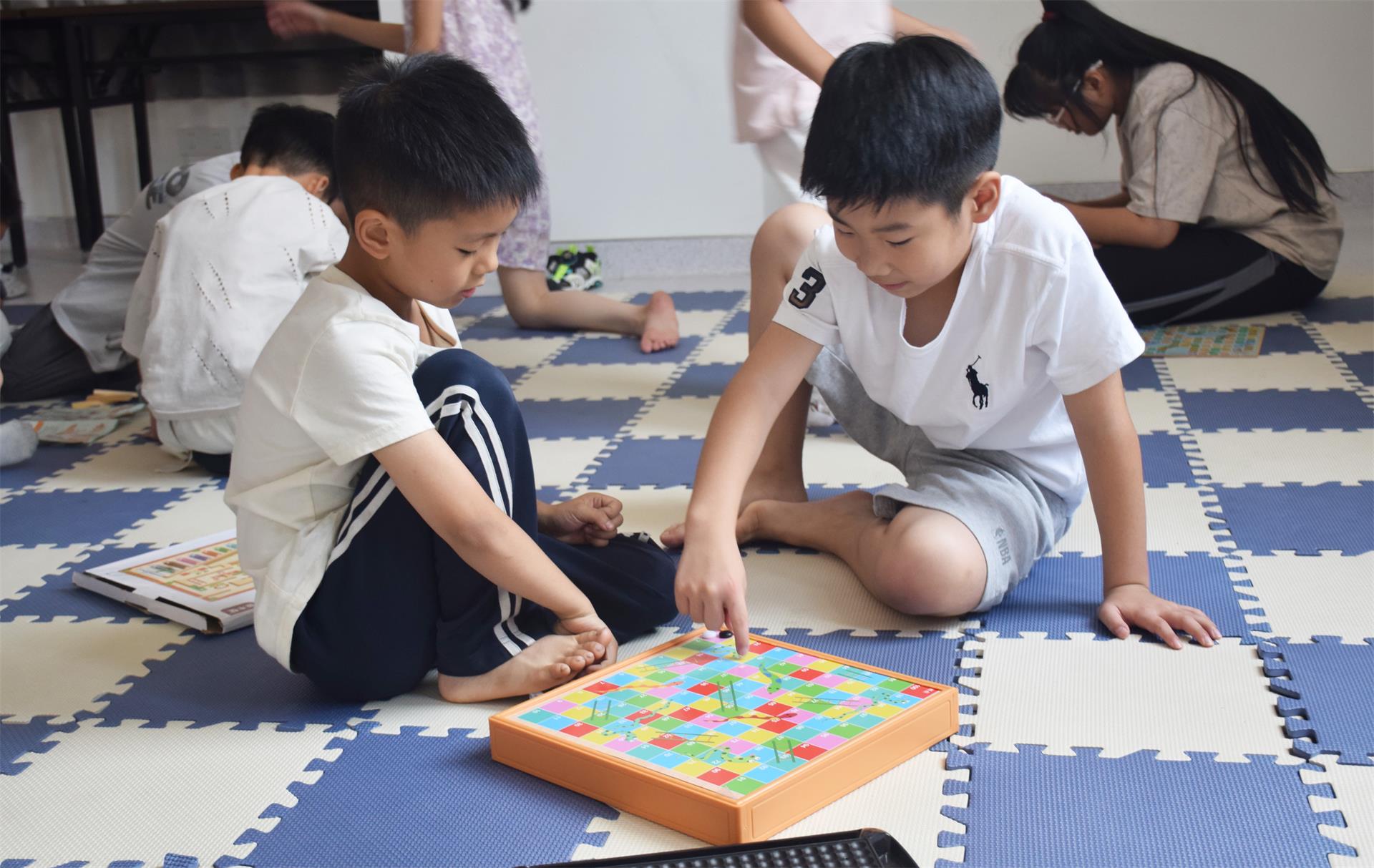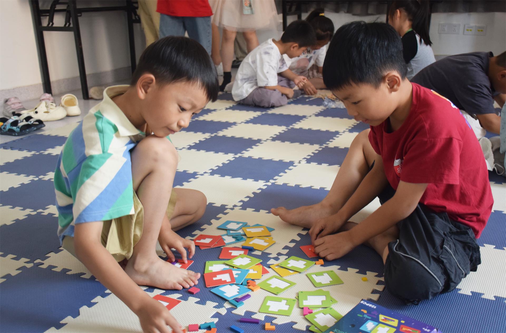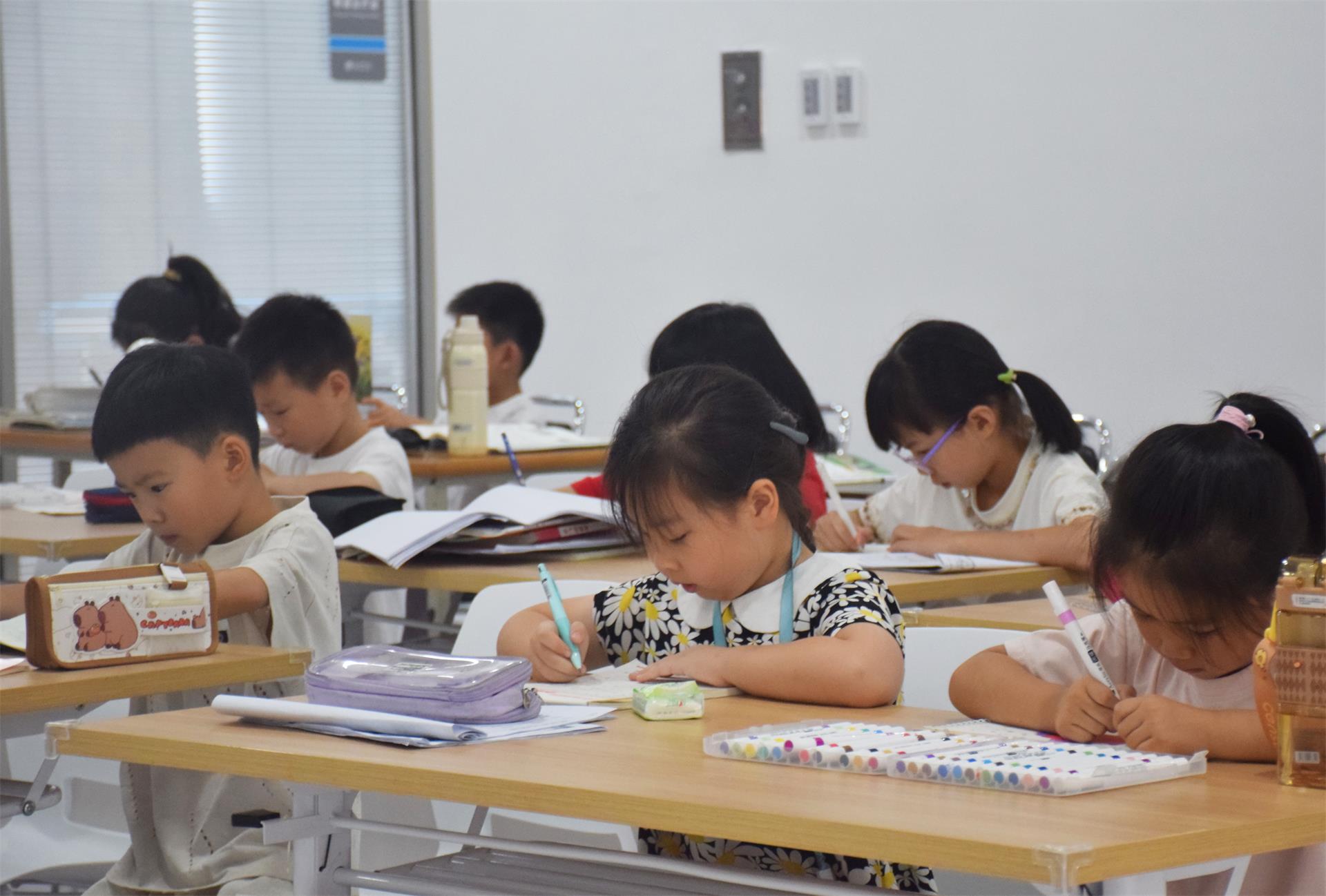 清晨的暑托班场地早已准备就绪,课桌椅整齐排列,墙上贴着孩子们喜欢的卡通贴纸,图书绘本按类别摆放得一目了然,活动区的积木、拼图等玩具静待“小主人”探索。
