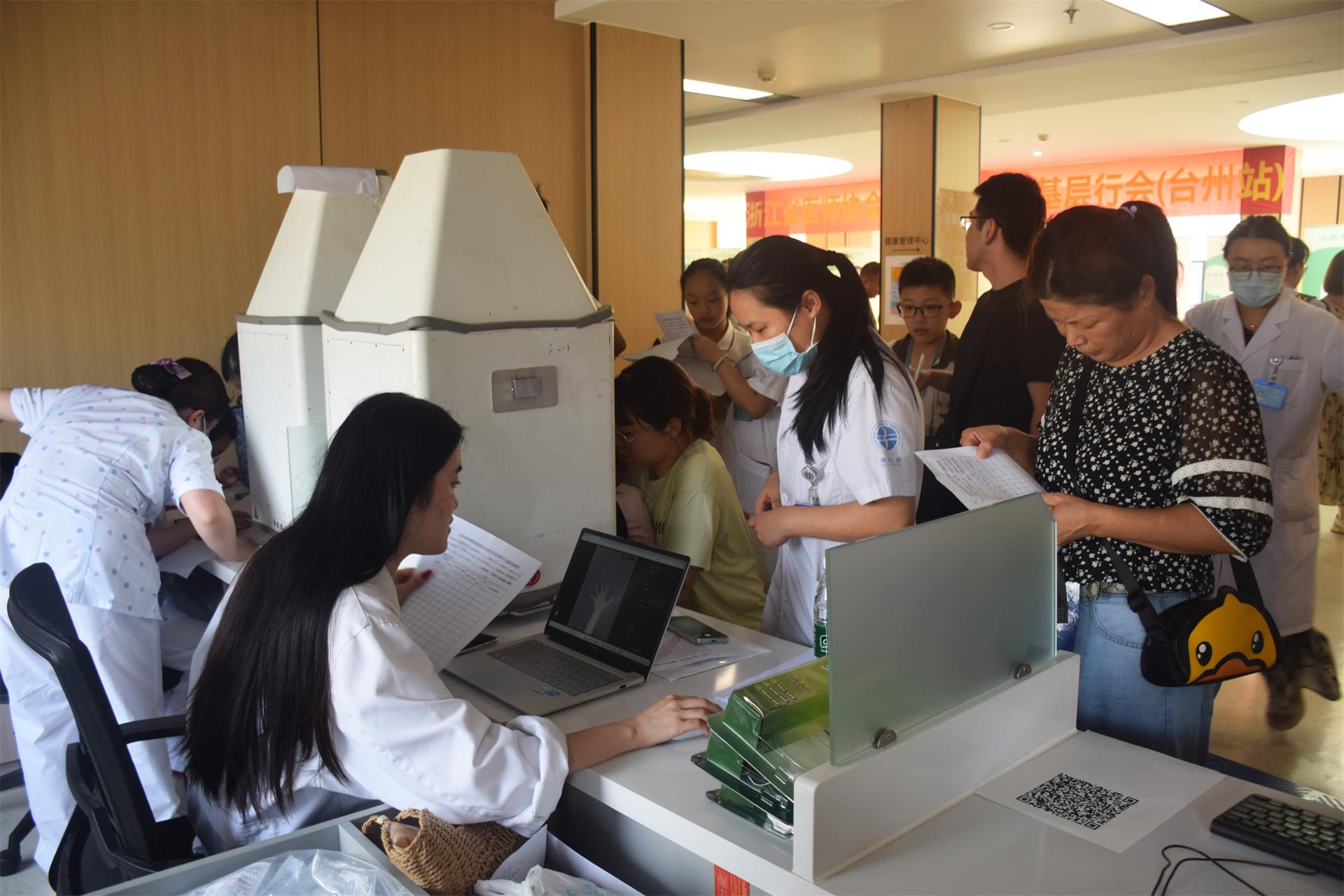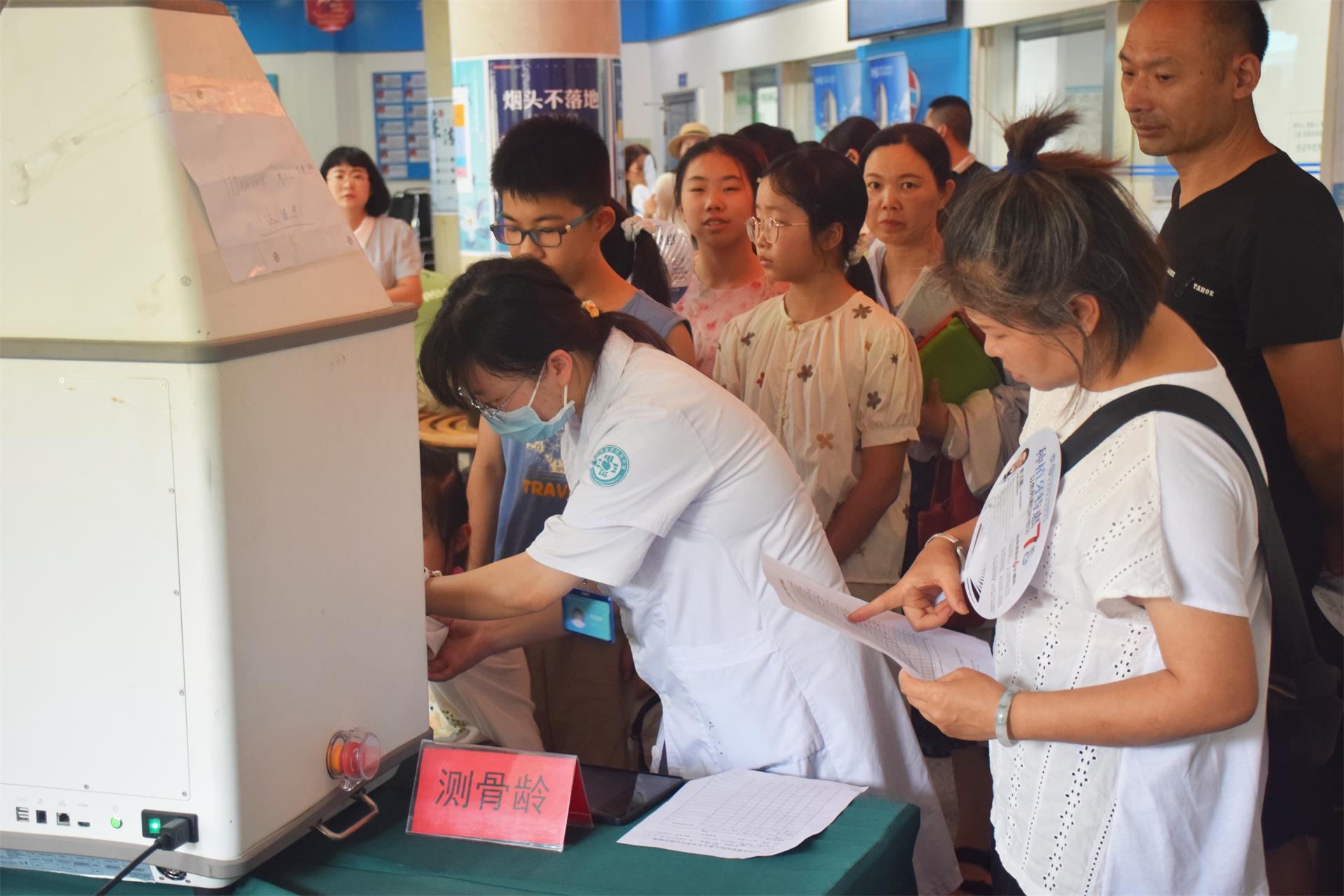 作为医院重点关注的公益项目,义诊现场从流程设计到服务配置均体现着对儿童健康的深切关怀。志愿者们全程引导家长有序排队、协助填写资料,以细致服务保障流程高效顺畅。家长们带着孩子踊跃参与,各项免费健康筛查项目备受青睐:从基础的身高体重测量,到体态及脊柱侧弯筛查,更有能评估骨骼发育状况的免费骨龄检测,全面覆盖儿童成长关键健康维度。