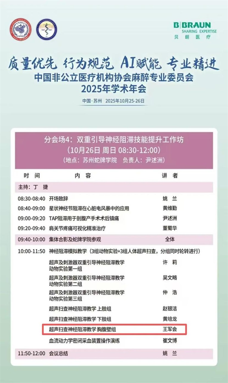 在这场汇聚国内外麻醉医学领域权威专家、吸引众多麻醉医生参与的行业盛会中,台州博爱医院专业院长、麻醉疼痛科主任王军会——作为协会连任两届常务委员,以重要嘉宾及核心授课教师双重身份受邀出席,凭借《胸腹壁组超声扫查神经阻滞》模拟教学,既展现了我院麻醉疼痛学科的专业硬实力,更以深耕行业的责任担当为学科发展赋能,赢得现场学员与同行的高度赞誉。