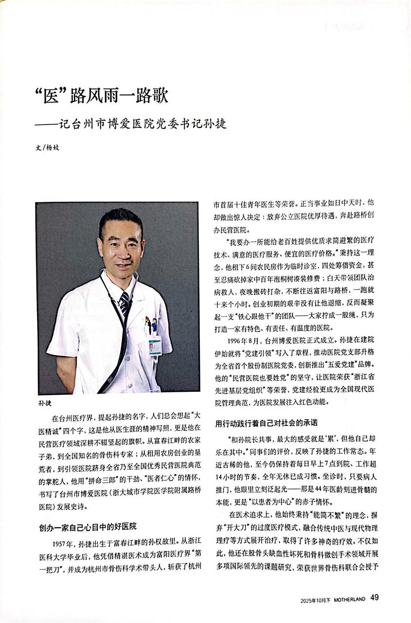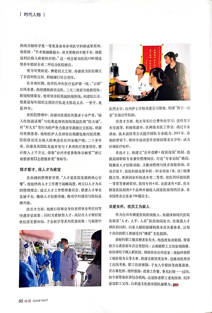 近日,《祖国》杂志时代人物版块中一篇以《“医”路风雨一路歌——记台州市博爱医院党委书记孙捷》为题,刊载了对我院孙捷教授的深度专访文章。专访聚焦孙捷教授怀仁心践初心,以医者担当创办医院,四十余载深耕医道、攻坚破难,用坚守与深耕谱写台州博爱医院高质量发展华章的奋斗历程。